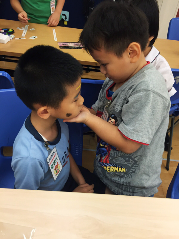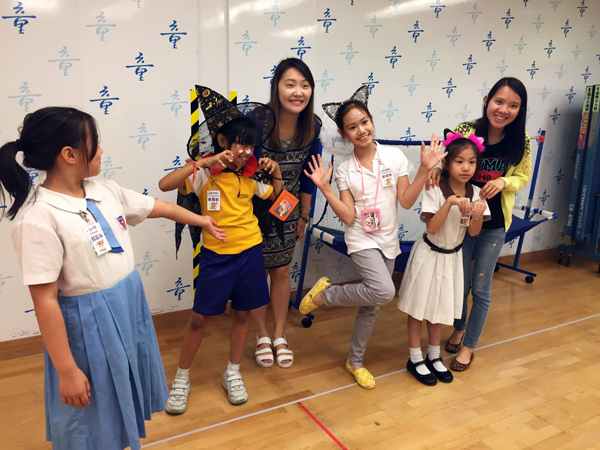 此次活動小朋友非常踴躍參與, 一共有30多位小朋友參加, 4-5個小朋友為一組, 一位小朋友作“鬼”, 其余小朋友為“鬼”的面上化妝,然后在身上配置裝飾, 義工們在一旁給小朋友出主意。亦有義工主動做模特兒, 由義工團隊扮作“鬼”提供給小朋友化妝。有的小朋友變成可愛小天使, 有的變成得意小魔怪, 亦有變成漂亮鬼新娘。