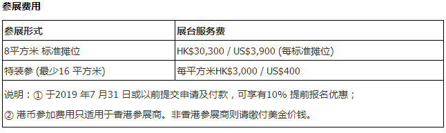 | 提早報名優惠 | 參展商于2019年 7月 31日或之前遞交報名表格及參展費用 | 9折 |