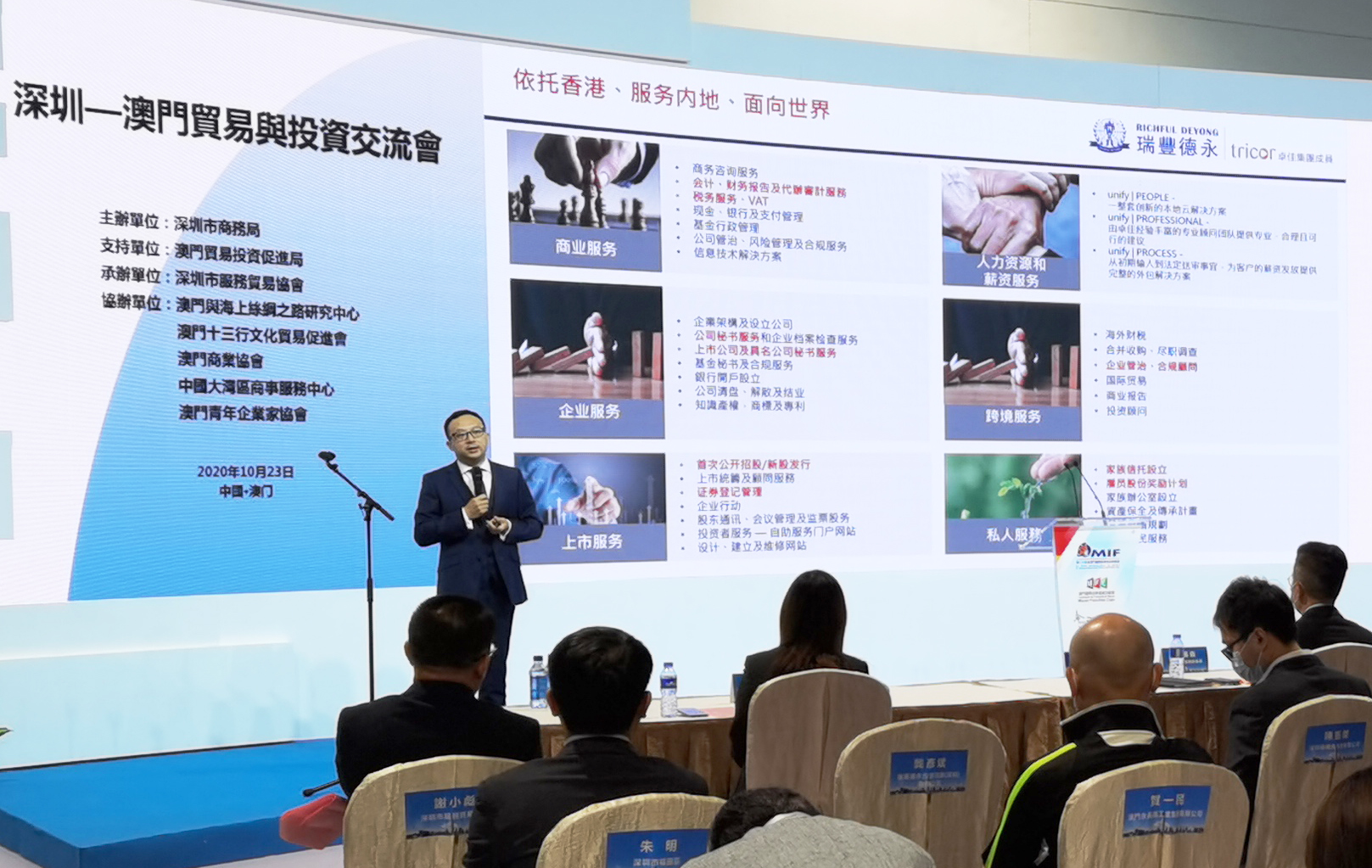 在10月23日上午舉辦的“第二屆深圳-澳門貿(mào)易與投資交流會(huì)”上,瑞豐德永集團(tuán)CEO龔彥斌先生應(yīng)邀就“瑞豐德永推動(dòng)大灣區(qū)經(jīng)貿(mào)合作案例”作了主題分享并與現(xiàn)場(chǎng)企業(yè)家們進(jìn)行了答疑交流。