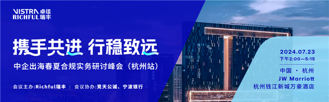 “攜手共進,行穩致遠:中企出海春夏合規實務研討峰會”活動于今日7月23日下午在杭州錢江新城萬豪酒店成功舉辦。本次峰會由Richful瑞豐發起和主辦,聯合Vistra卓佳、競天公誠、寧波銀行協辦,吸引了近百位來自華東地區的企業高管報名參會。