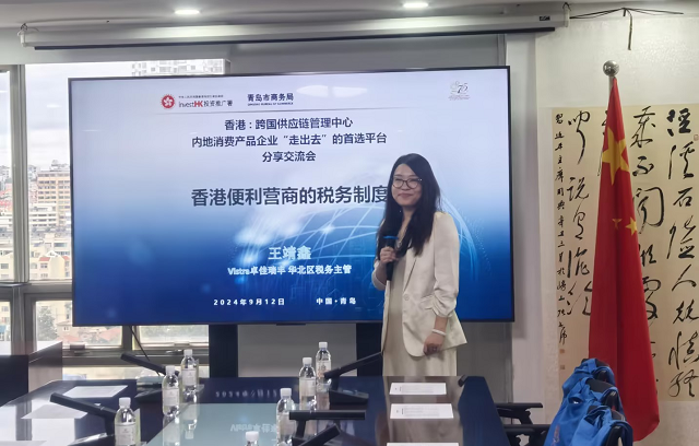 會議由青島市商務局黨組成員、副局長李鋒先生致歡迎詞。隨后,香港特區政府投資推廣署上海辦事處總監林景富先生、香港特區政府投資推廣署總裁(消費產品)梁耀云先生以及RICHFUL瑞豐華北區稅務主管王靖鑫女士,先后圍繞”香港的營商優勢”、“香港消費品市場的現況和機遇“及“香港便利營商的稅務制度”等三大主題進行了解讀和深度分析,分享實踐經驗。
