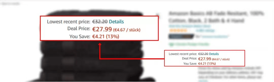 因此,亞馬遜歐洲站(除英國站外)的商品已經(或將會)顯示過去30天該商品在亞馬遜商城的最低價,標記為“近期最低價(Lowest recent price)” ,如下圖所示。鮮明的價格對比會增加視覺沖擊力,也能讓您的商品更具競爭力和吸引力。
