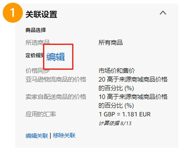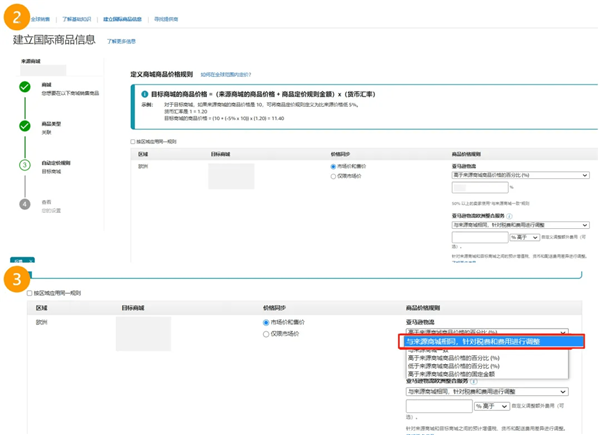 您可以通過:在【建立國際商品信息】頁面右側的關聯設置 > 點擊定價規則的【編輯】 > 在下拉菜單中選擇“與來源站點相同,針對稅費和費用進行調整“來啟用這項自動定價規則。