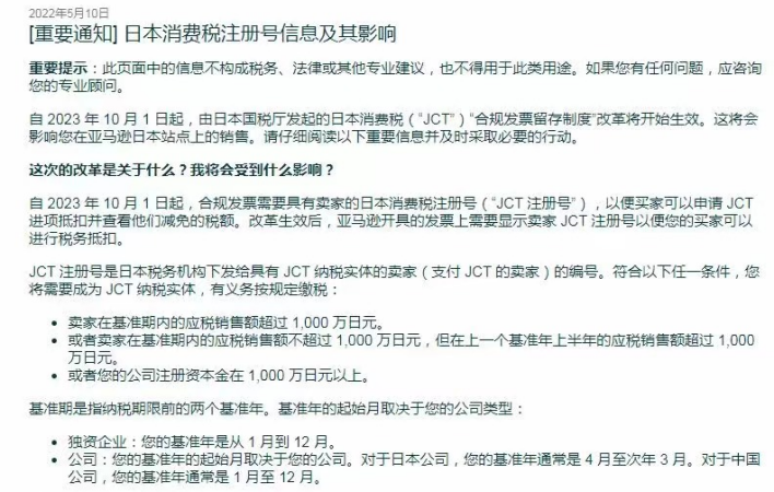 5月10日,亞馬遜日本站的賣家后臺都收到一則通知,日本消費(fèi)稅(JCT)“合規(guī)發(fā)票留存制度”改革將于2023年10月1日起生效。根據(jù)合規(guī)要求,日本賣家需要注冊消費(fèi)稅號JCT,否則將無法開具發(fā)票,無法讓買家申請JCT進(jìn)項(xiàng)抵扣并查看他們減免的稅額。