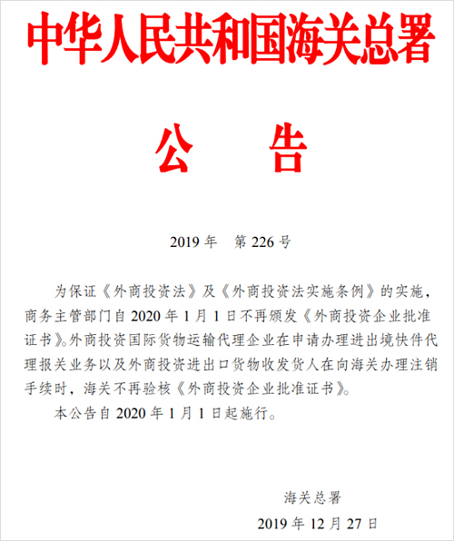 海關總署近日發(fā)布公告稱,為保證《外商投資法》及《外商投資法實施條例》的實施,商務主管部門自2020年1月1日不再頒發(fā)《外商投資企業(yè)批準證書》。外商投資國際貨物運輸代理企業(yè)在申請辦理進出境快件代理報關業(yè)務以及外商投資進出口貨物收發(fā)貨人在向海關辦理注銷手續(xù)時,海關不再驗核《外商投資企業(yè)批準證書》。(來源:第一財經)