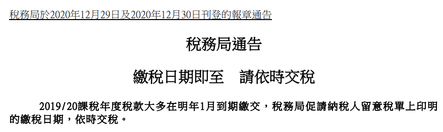 近期香港稅務(wù)局官網(wǎng)刊登了一則通告【繳稅期即至 請(qǐng)依時(shí)交稅】,2019/20課稅年度稅款在1月份即將到期繳納,提醒各納稅人留意稅單上的繳納日期,按時(shí)交稅。1月所剩時(shí)間已不多,瑞豐德永提醒相關(guān)納稅人注意時(shí)間節(jié)點(diǎn)。
