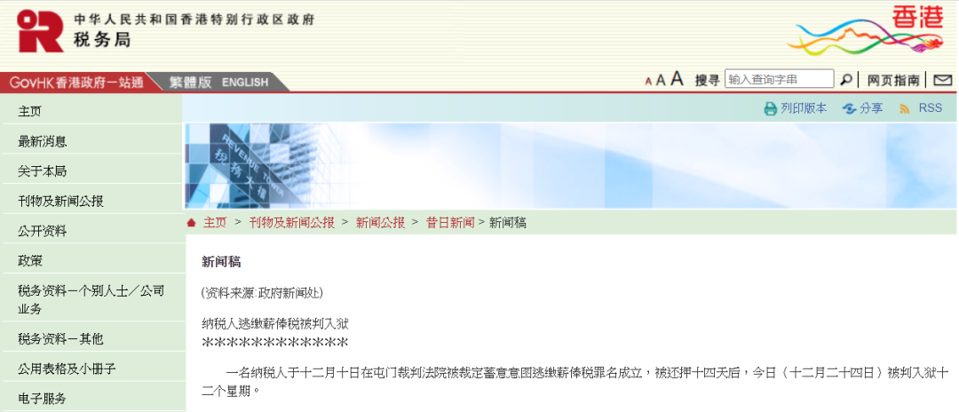 稅務(wù)局發(fā)言人提醒納稅人,《稅務(wù)條例》訂明逃稅是刑事罪行。一經(jīng)定罪,每項(xiàng)控罪最高刑罰為入獄三年和罰款五萬(wàn)元,另加一筆相等于少征收稅款三倍的罰款。 我們翻看稅務(wù)局官網(wǎng),能發(fā)現(xiàn)稅務(wù)局會(huì)定期公布的關(guān)于相應(yīng)逃稅違法行為的案例,比如在12月24日,香港稅務(wù)局發(fā)布了一則新聞公報(bào) “一名納稅人被法法院裁定蓄意意圖逃稅罪名成立”。