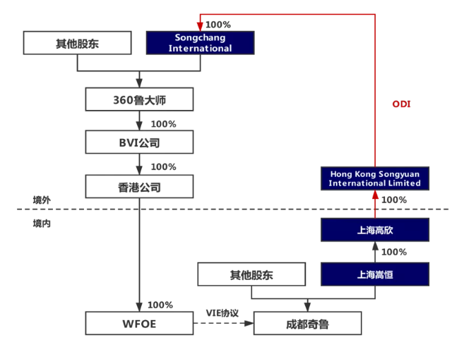 在近期赴港完成上市的新經濟企業中,360魯大師通過重組搭建了VIE架構,其中注冊在英屬開曼群島的360魯大師為境外融資平臺及上市主體,注冊在境內的成都奇魯科技有限公司(簡稱“成都奇魯”)為境內VIE公司。