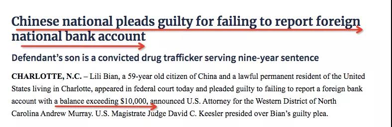 2019年7月8日,住在北卡夏洛特市的59歲中國公民Lili,出現(xiàn)在聯(lián)邦法庭認(rèn)罪。她持有美國綠卡,承認(rèn)在中國境內(nèi)某金融機(jī)構(gòu),有超過1萬美元的賬戶,且未向財(cái)政部上報(bào)外國銀行和金融帳戶表格(Foreign Bank and Financial Account Form,F(xiàn)BAR),繼而遭到聯(lián)邦起訴。
