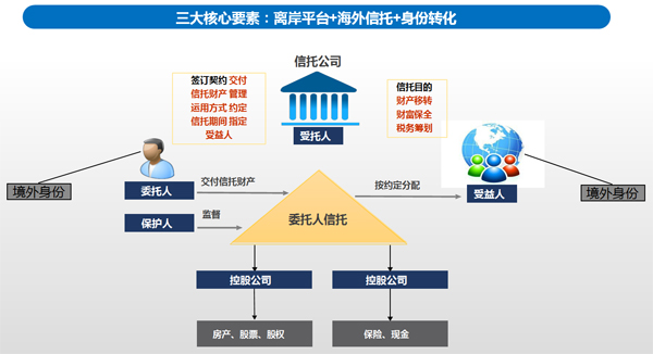 海外資產管理和投資的離岸架構有三個核心要素,一為身份轉化,二為離岸平臺,三為海外信托計劃。
