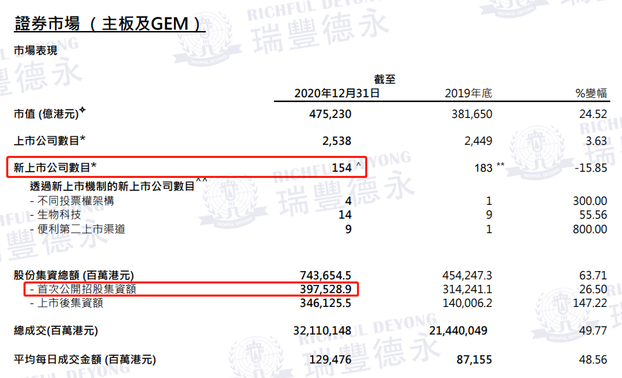 2020年香港新股市場表現(xiàn)奪目,整年香港交易所總集資額全球排名第二,全年共有154新股上市,盡管受到新冠疫情影響,2020年全球宏觀經(jīng)濟表現(xiàn)欠佳,但是融資額高達3975億港元,同比增加26.5%,第一名將是美國納斯達克,緊跟香港的是上海證券交易所排名第三。