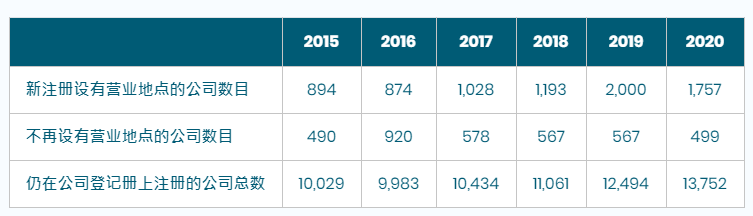 自2014年起,截至2020年年底,根據《公司條例》注冊的本地公司總數達1,387,919間,較2019年增加了7,734間。