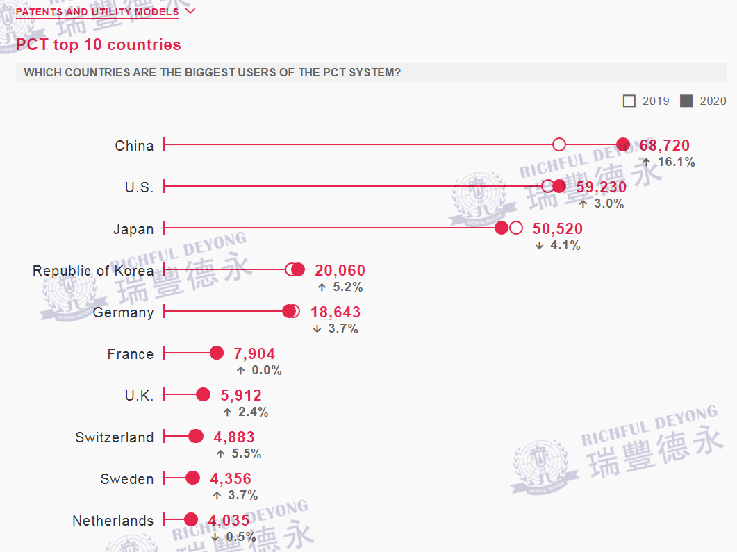 數(shù)據(jù)顯示,2020年,全球GDP預(yù)計(jì)降低3.5%,但2020年的《專利合作條約》PCT途徑提交的國(guó)際專利申請(qǐng)量比較2019年增長(zhǎng)了4%,達(dá)到27.59萬(wàn)件申請(qǐng),這是有史以來(lái)的最高數(shù)量。