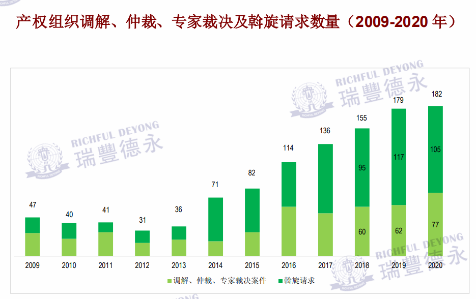 根據(jù)世界知識(shí)產(chǎn)權(quán)組織發(fā)布的最新數(shù)據(jù)顯示,自2013年以來(lái),世界產(chǎn)權(quán)組織調(diào)解、仲裁、專家裁決及斡旋請(qǐng)求數(shù)量逐年增長(zhǎng),2020年創(chuàng)下新高一共182件,調(diào)解、仲裁、專家裁決案件77宗,斡旋請(qǐng)求105宗。