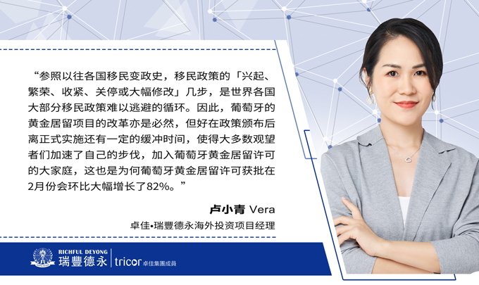 面對(duì)葡萄牙2月黃金居留許可大幅增長(zhǎng)的數(shù)據(jù),瑞豐德永海外投資項(xiàng)目經(jīng)理盧小青女士分享了她對(duì)當(dāng)前葡萄牙投資移民形勢(shì)的見解。