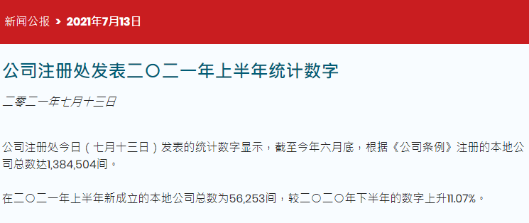 7月13日,香港公司注冊處發(fā)表2021年上半年統(tǒng)計數(shù)字,統(tǒng)計數(shù)字顯示,截至今年六月底,根據(jù)《公司條例》注冊的本地公司總數(shù)達(dá)1,384,504間。在2021年上半年新成立的本地公司總數(shù)為56,253間,較2020年下半年的數(shù)字上升11.07%。...