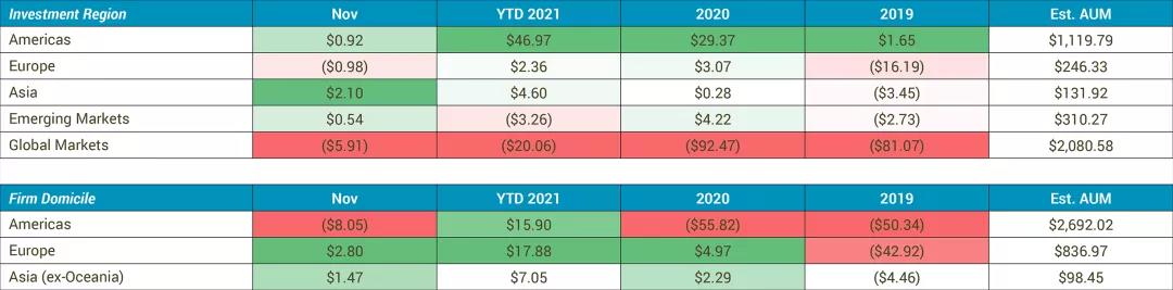 據納斯達克(Nasdaq)旗下的投資數據分析公司eVestment數據,截止2021年11月,亞洲對沖基金行業總資產(AUM)約為1,319.2億美元,較美洲的11,197.9億美元還有很大的差距。但2021年前11個月,該區不論是投資流量還是管理公司資產管理規模,都遠超去年全年。