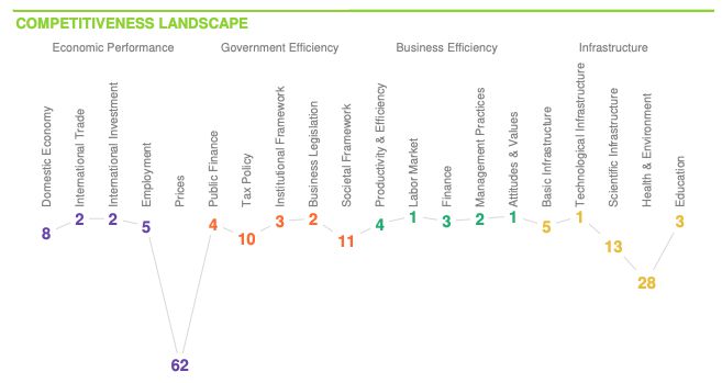 新加坡在總體生產(chǎn)率、熟練勞動(dòng)力可用性、法規(guī)遵從性以及風(fēng)險(xiǎn)投資和銀行金融服務(wù)等九個(gè)領(lǐng)域排名第一。