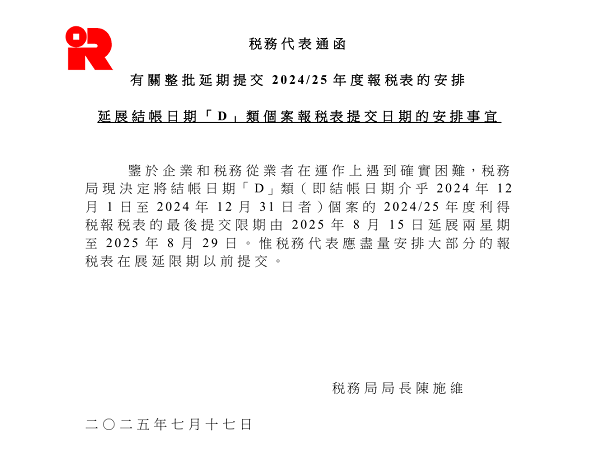 香港稅務(wù)局于2025年7月17日發(fā)布通告,鑒于企業(yè)與稅務(wù)服務(wù)機(jī)構(gòu)的年底結(jié)賬操作困難,正式延長(zhǎng)D類(lèi)公司(財(cái)務(wù)年度結(jié)束于2024年12月1日-31日)的利得稅申報(bào)期限——由原定的2025年8月15日延后兩周至2025年8月29日。本次延期旨在緩解申報(bào)壓力,但需注意8月29日為最終截止日,逾期將面臨合規(guī)風(fēng)險(xiǎn)。